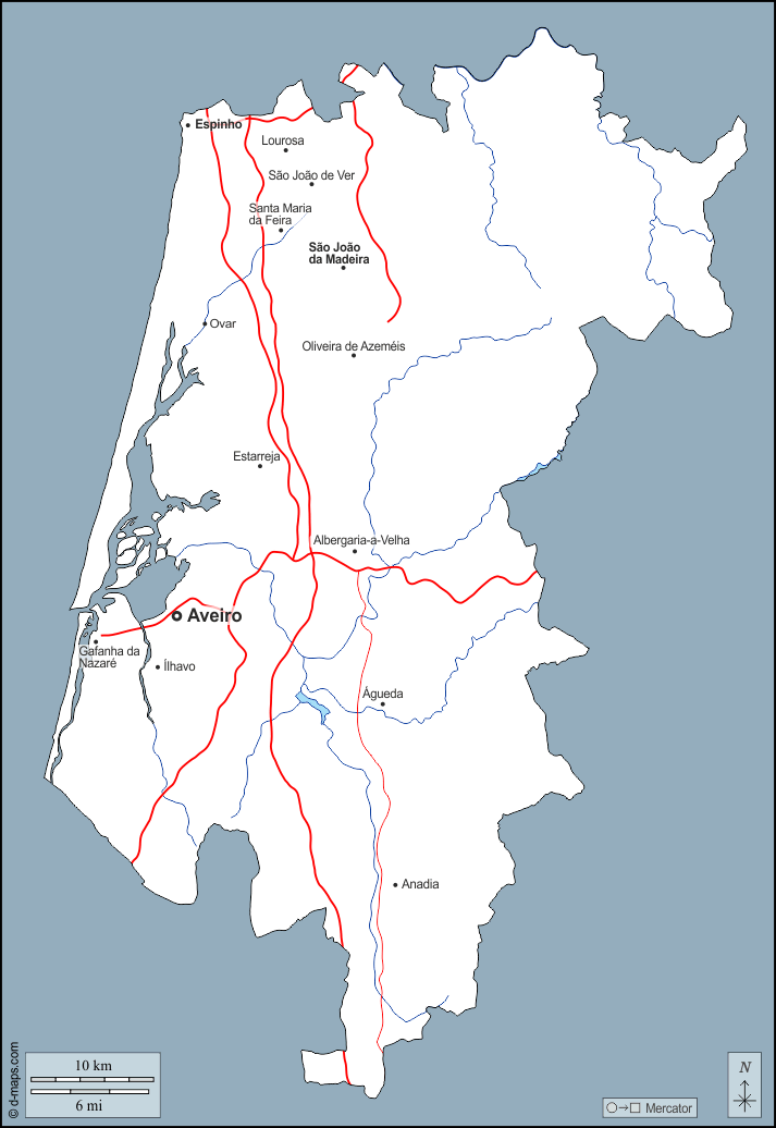 d-maps > यूरोप > पुर्तगाल > उत्तर पश्चिम > बाह्यरेखा, जल-सर्वेक्षण, मुख्य शहरों, सड़कों, नाम