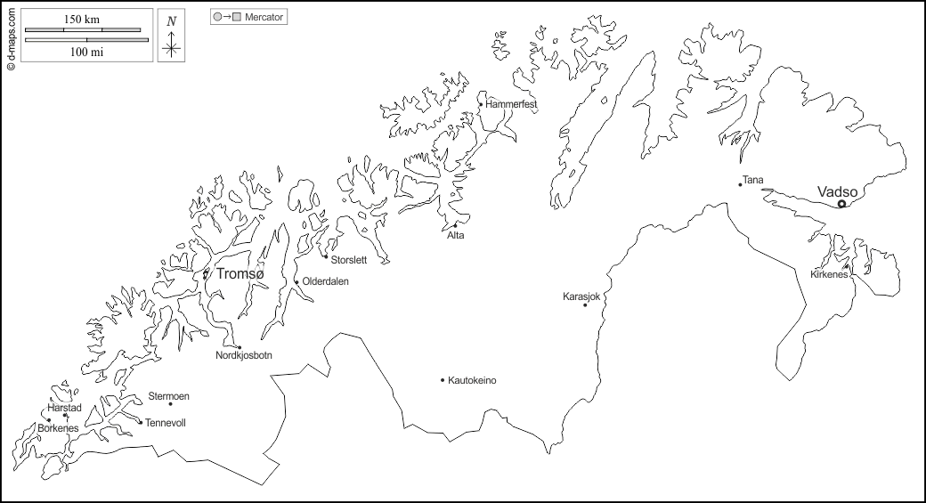 d-maps > यूरोप > नॉर्वे > ट्रॉम्स और फिनमार्क > बाह्यरेखा, मुख्य शहरों, नाम, सफेद