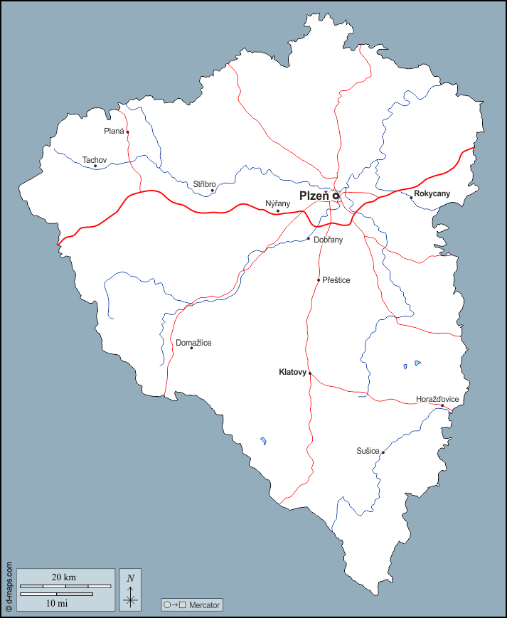 d-maps > यूरोप > चेक गणराज्य > पीएलज़े > बाह्यरेखा, जल-सर्वेक्षण, मुख्य शहरों, सड़कों, नाम