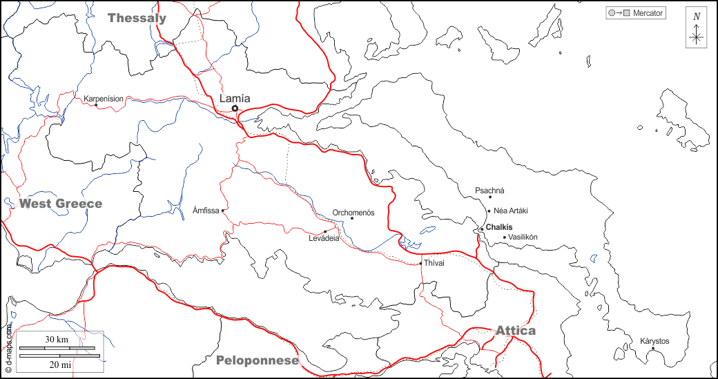 d-maps > यूरोप > यूनान > मध्य ग्रीस > सीमाओं, जल-सर्वेक्षण, मुख्य शहरों, सड़कों, नाम, सफेद