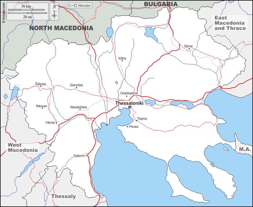 d-maps > यूरोप > यूनान > सेंट्रल मैसेडोनिया > सीमाओं, जल-सर्वेक्षण, मुख्य शहरों, सड़कों, नाम