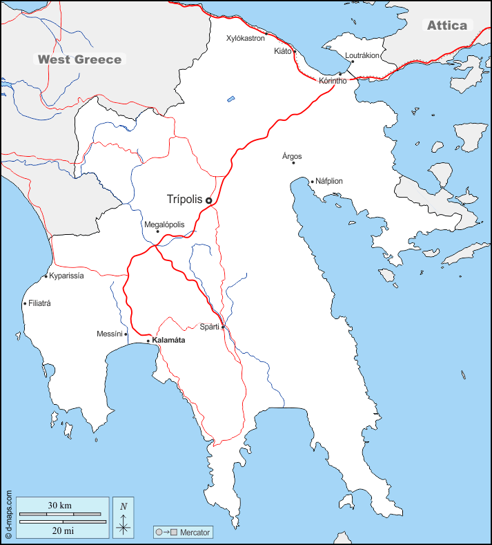 d-maps > यूरोप > यूनान > दक्षिण ग्रीस > सीमाओं, जल-सर्वेक्षण, मुख्य शहरों, सड़कों, नाम