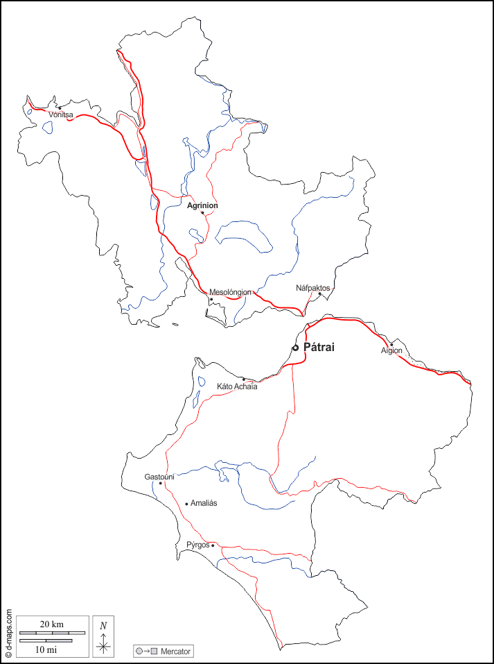 d-maps > यूरोप > यूनान > पश्चिम ग्रीस > बाह्यरेखा, जल-सर्वेक्षण, मुख्य शहरों, सड़कों, नाम, सफेद