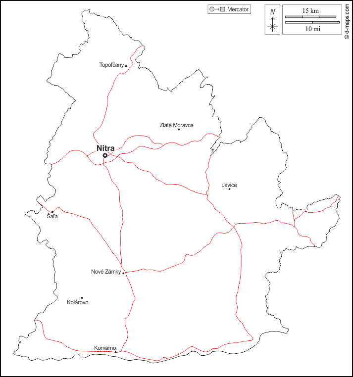 d-maps > यूरोप > स्लोवाकिया > नितरा > बाह्यरेखा, मुख्य शहरों, सड़कों, नाम, सफेद