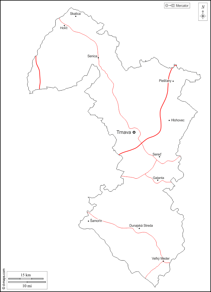 d-maps > यूरोप > स्लोवाकिया > त्रिनवा > बाह्यरेखा, मुख्य शहरों, सड़कों, नाम, सफेद