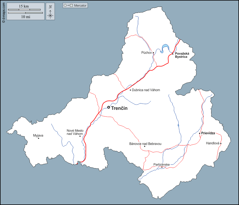 d-maps > यूरोप > स्लोवाकिया > ट्रेनेचिन > बाह्यरेखा, जल-सर्वेक्षण, मुख्य शहरों, सड़कों, नाम