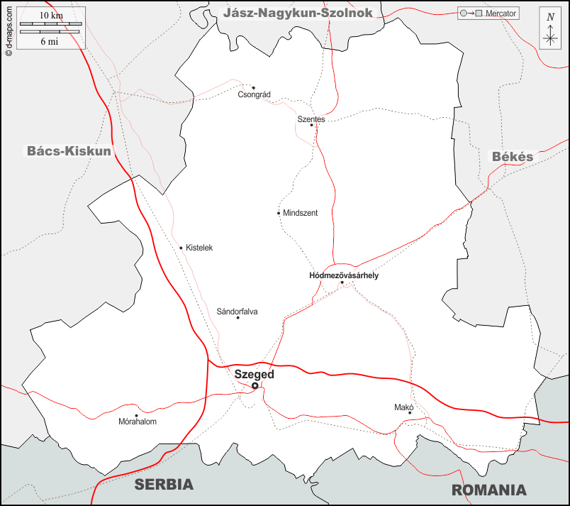 d-maps > यूरोप > हंगरी > काउंटी > सीमाओं, मुख्य शहरों, सड़कों, नाम