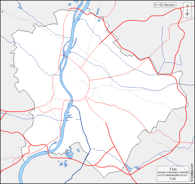 d-maps > यूरोप > हंगरी > बुडापेस्ट > सीमाओं, जल-सर्वेक्षण, सड़कों