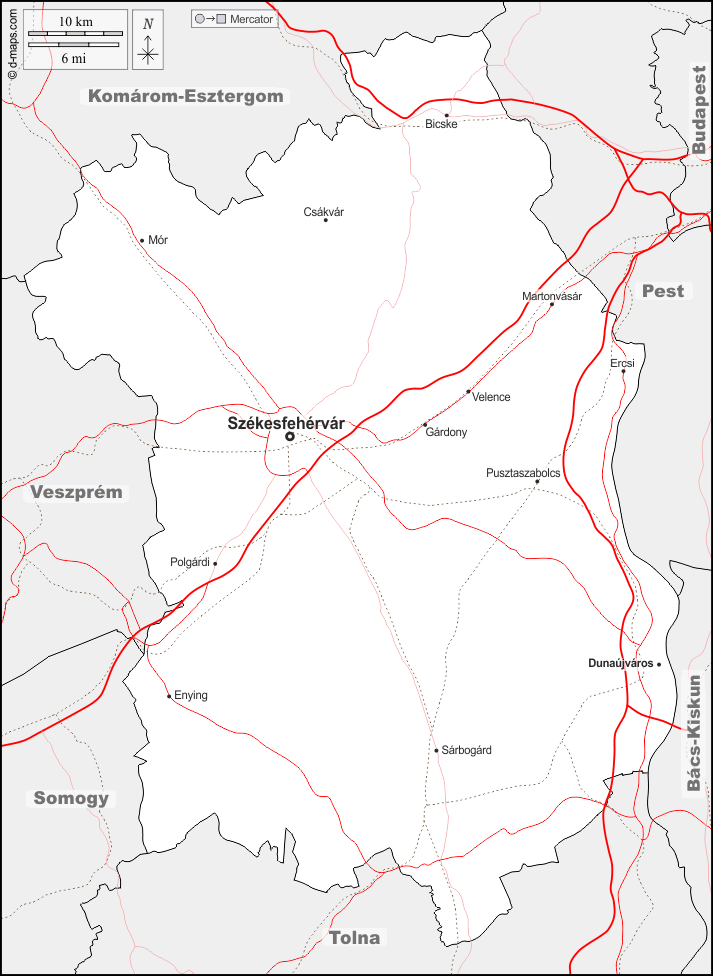 d-maps > यूरोप > हंगरी > फेजर > सीमाओं, मुख्य शहरों, सड़कों, नाम