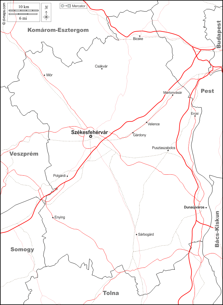 d-maps > यूरोप > हंगरी > फेजर > सीमाओं, मुख्य शहरों, सड़कों, नाम, सफेद