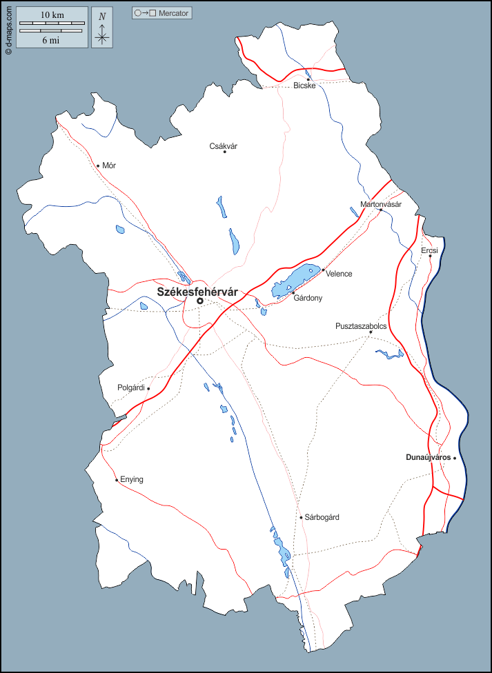 d-maps > यूरोप > हंगरी > फेजर > बाह्यरेखा, जल-सर्वेक्षण, मुख्य शहरों, सड़कों, नाम