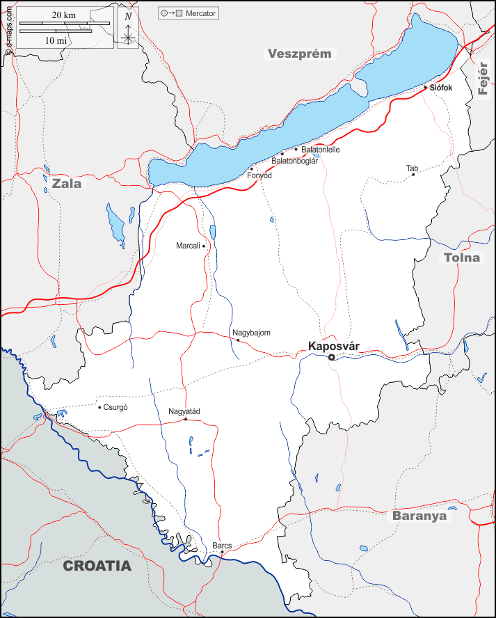 d-maps > यूरोप > हंगरी > सोमोगी > सीमाओं, जल-सर्वेक्षण, मुख्य शहरों, सड़कों, नाम