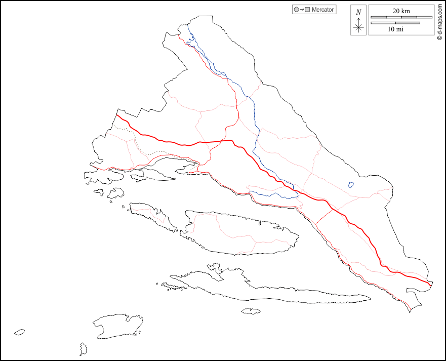 d-maps > यूरोप > क्रोएशिया > स्प्लिट-डालमेटिया काउंटी > बाह्यरेखा, जल-सर्वेक्षण, सड़कों, सफेद