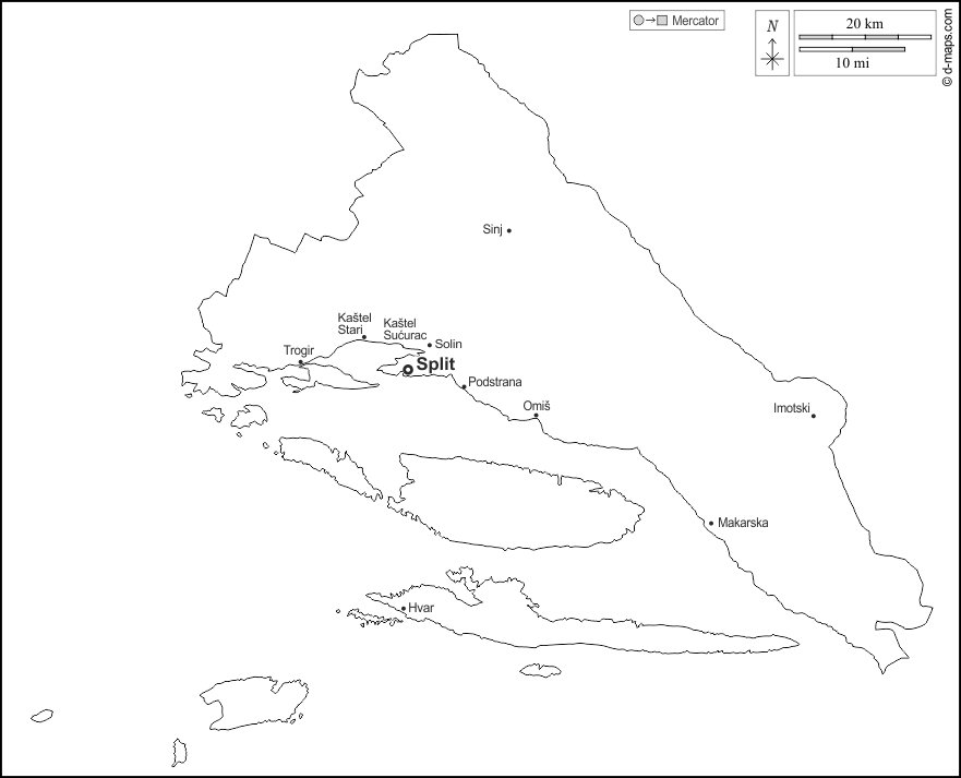 d-maps > यूरोप > क्रोएशिया > स्प्लिट-डालमेटिया काउंटी > बाह्यरेखा, मुख्य शहरों, नाम, सफेद