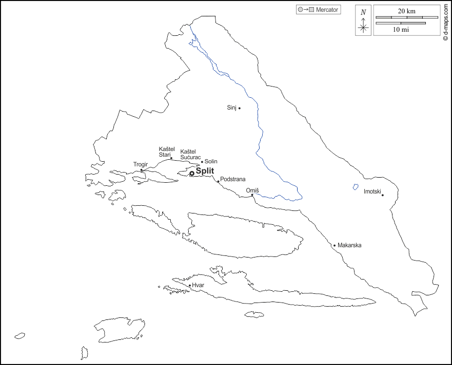 d-maps > यूरोप > क्रोएशिया > स्प्लिट-डालमेटिया काउंटी > बाह्यरेखा, जल-सर्वेक्षण, मुख्य शहरों, नाम, सफेद
