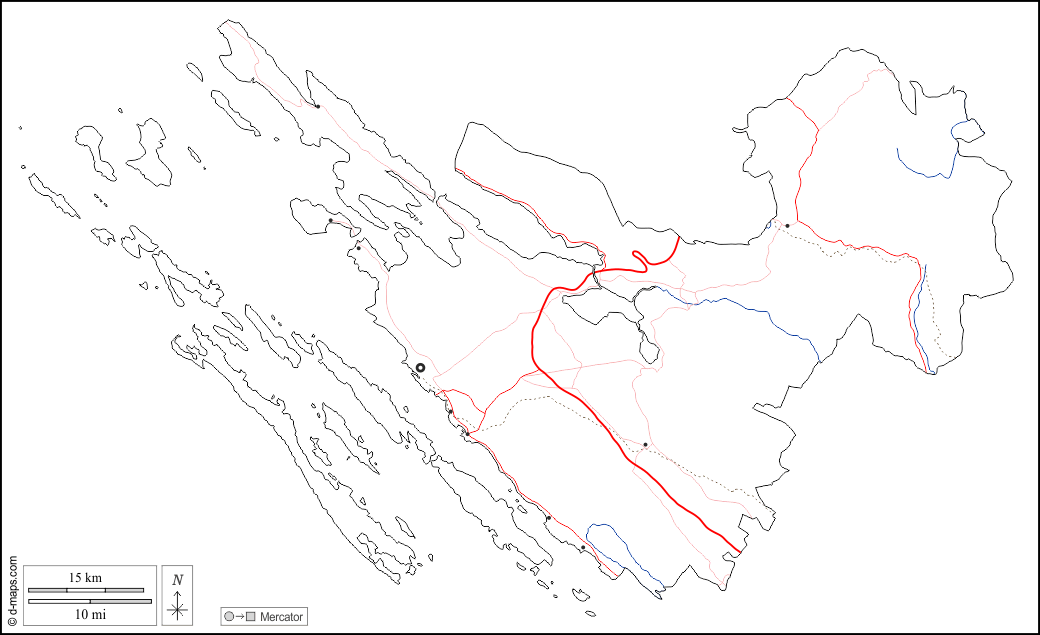 d-maps > यूरोप > क्रोएशिया > ज़ादर काउंटी > बाह्यरेखा, जल-सर्वेक्षण, मुख्य शहरों, सड़कों, सफेद