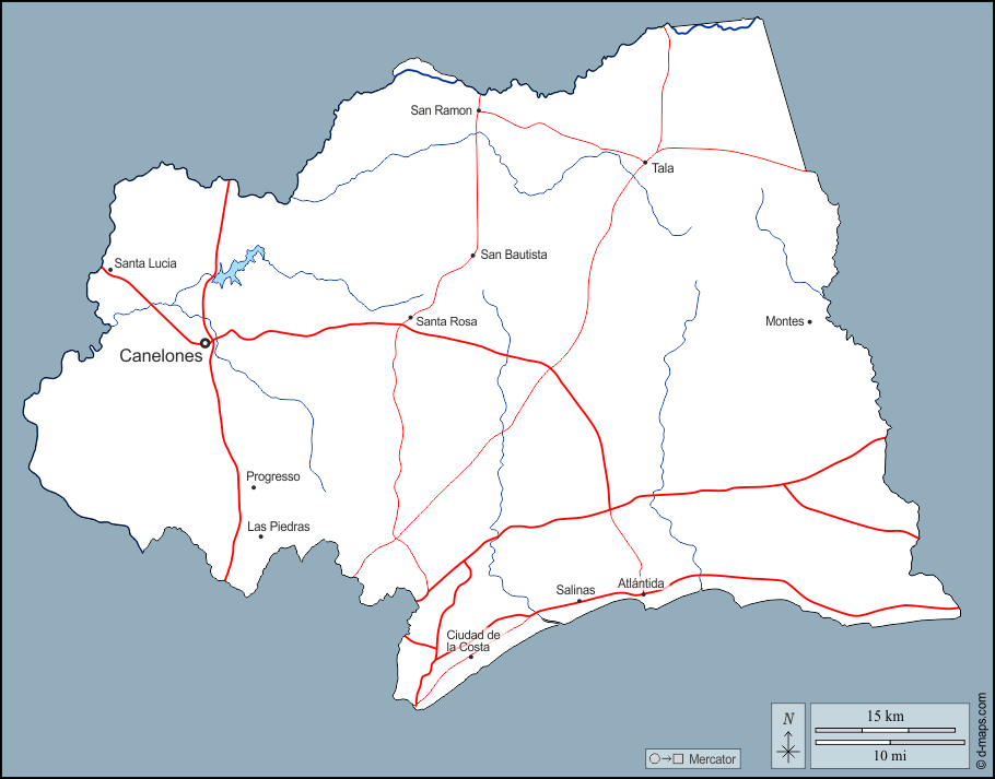 d-maps > महाअमेरिका > उरुग्वे > कैनेलोनी > बाह्यरेखा, जल-सर्वेक्षण, मुख्य शहरों, सड़कों, नाम