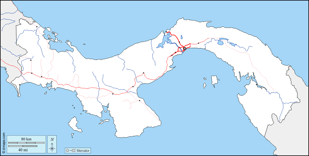 d-maps > महाअमेरिका > पनामा > सीमाओं, जल-सर्वेक्षण, मुख्य शहरों, सड़कों