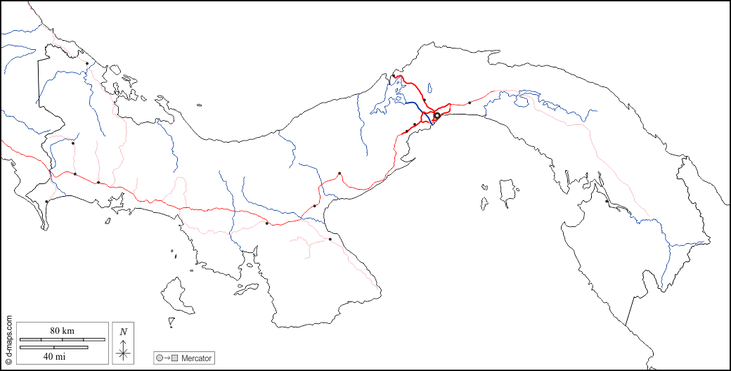 d-maps > महाअमेरिका > पनामा > सीमाओं, जल-सर्वेक्षण, मुख्य शहरों, सड़कों, सफेद