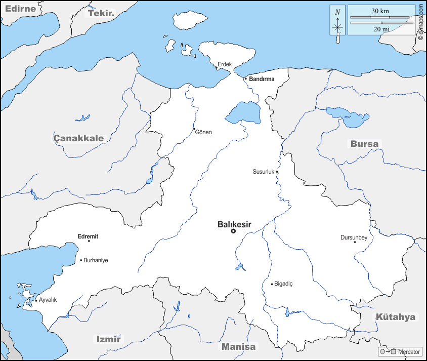 d-maps > एशिया > तुर्की > बालीकेसिर > सीमाओं, जल-सर्वेक्षण, मुख्य शहरों, नाम
