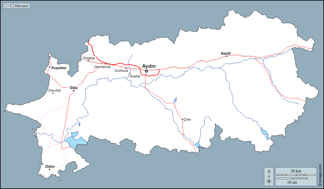 d-maps > एशिया > तुर्की > अयदीन > बाह्यरेखा, जल-सर्वेक्षण, मुख्य शहरों, सड़कों, नाम