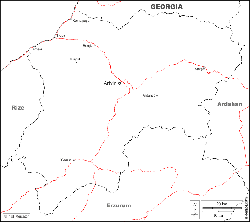 d-maps > एशिया > तुर्की > आर्टविन > सीमाओं, मुख्य शहरों, सड़कों, नाम, सफेद