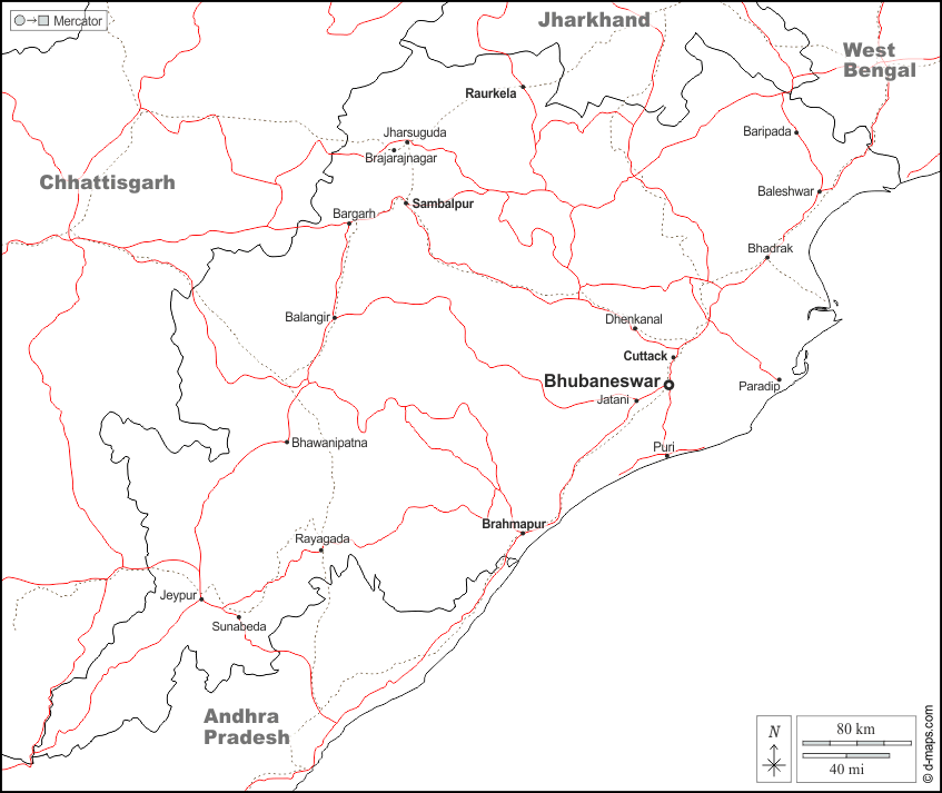 d-maps > एशिया > भारत > ओडिशा > सीमाओं, मुख्य शहरों, सड़कों, नाम, सफेद