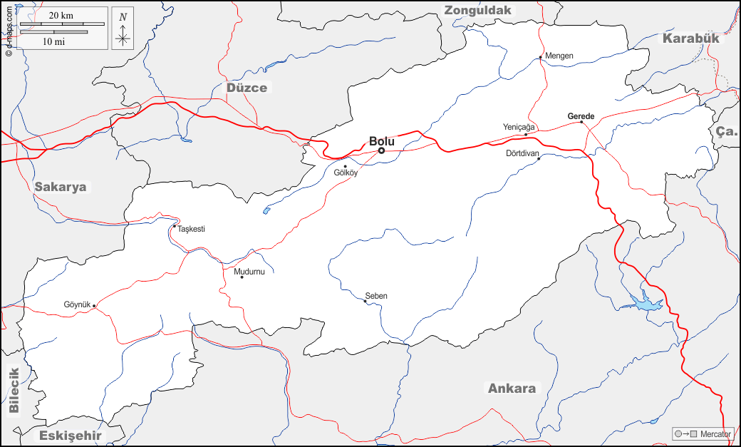 d-maps > एशिया > तुर्की > बोलू > सीमाओं, जल-सर्वेक्षण, मुख्य शहरों, सड़कों, नाम