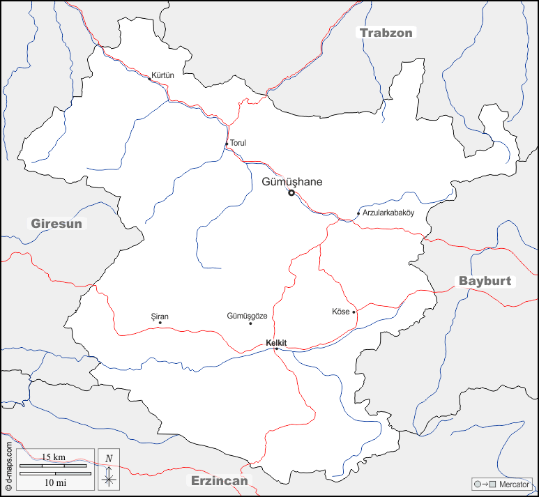 d-maps > एशिया > तुर्की > गुम्हाने > सीमाओं, जल-सर्वेक्षण, मुख्य शहरों, सड़कों, नाम