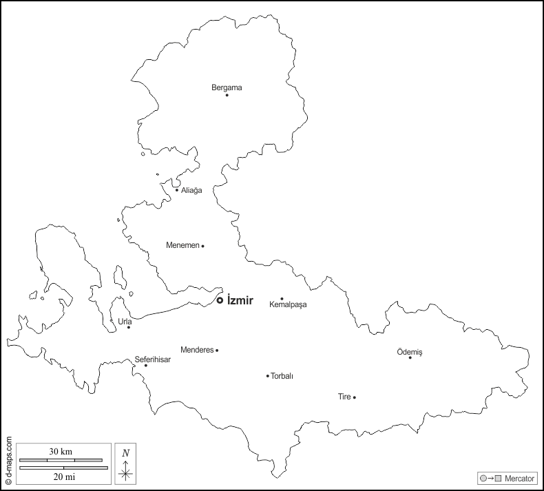 d-maps > एशिया > तुर्की > इज़मीर > बाह्यरेखा, मुख्य शहरों, नाम, सफेद