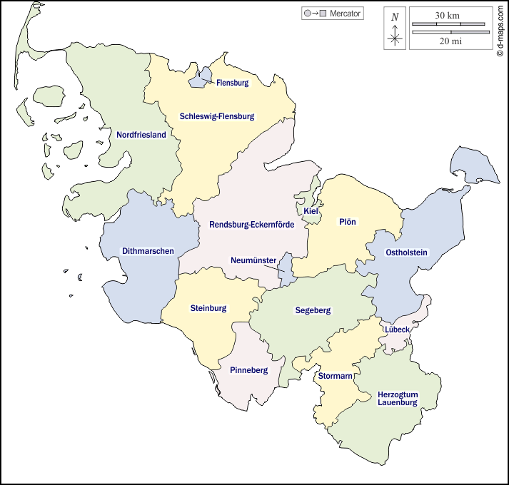 d-maps > यूरोप > जर्मनी > श्लेस्विग-होल्स्टीन राज्य > बाह्यरेखा, जिलों, नाम, रंग, सफेद