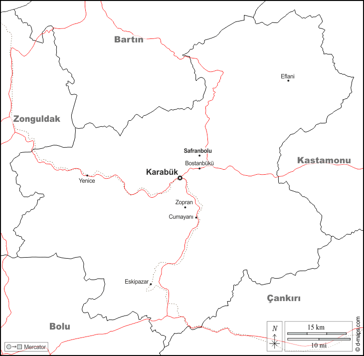 d-maps > एशिया > तुर्की > काराबुक > सीमाओं, मुख्य शहरों, सड़कों, नाम, सफेद
