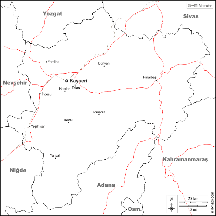 d-maps > एशिया > तुर्की > कायेरी > सीमाओं, मुख्य शहरों, सड़कों, नाम, सफेद