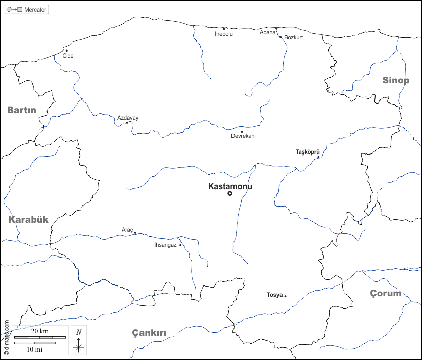 d-maps > एशिया > तुर्की > कास्टामोनू > सीमाओं, जल-सर्वेक्षण, मुख्य शहरों, नाम, सफेद