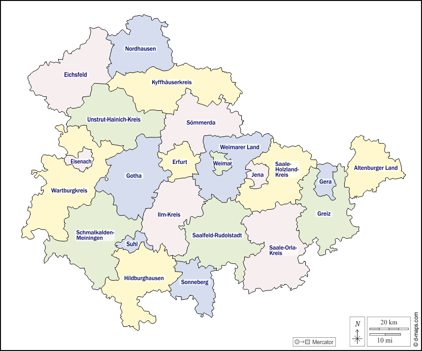 d-maps > यूरोप > जर्मनी > थुरिंगिया का स्वतंत्र राज्य > बाह्यरेखा, जिलों, नाम, रंग, सफेद