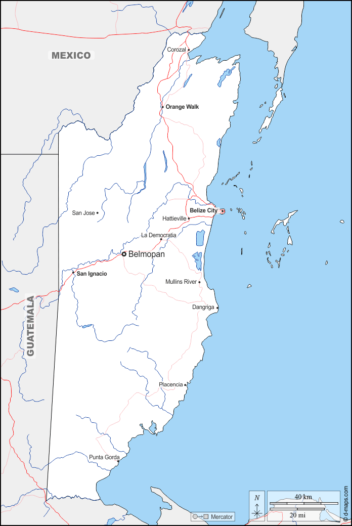 d-maps > महाअमेरिका > बेलीज़ > सीमाओं, जल-सर्वेक्षण, मुख्य शहरों, सड़कों, नाम