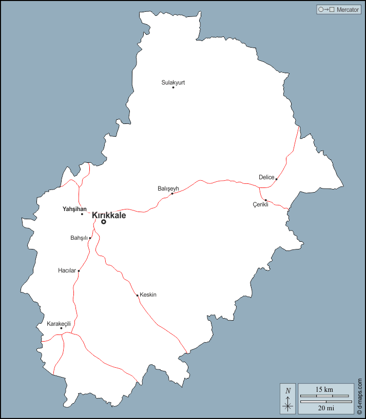 d-maps > एशिया > तुर्की > किरिक्काले > बाह्यरेखा, मुख्य शहरों, सड़कों, नाम