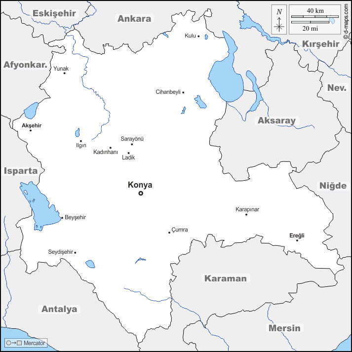 d-maps > एशिया > तुर्की > कोन्या। > सीमाओं, जल-सर्वेक्षण, मुख्य शहरों, नाम