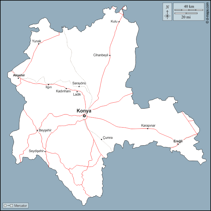 d-maps > एशिया > तुर्की > कोन्या। > बाह्यरेखा, मुख्य शहरों, सड़कों, नाम