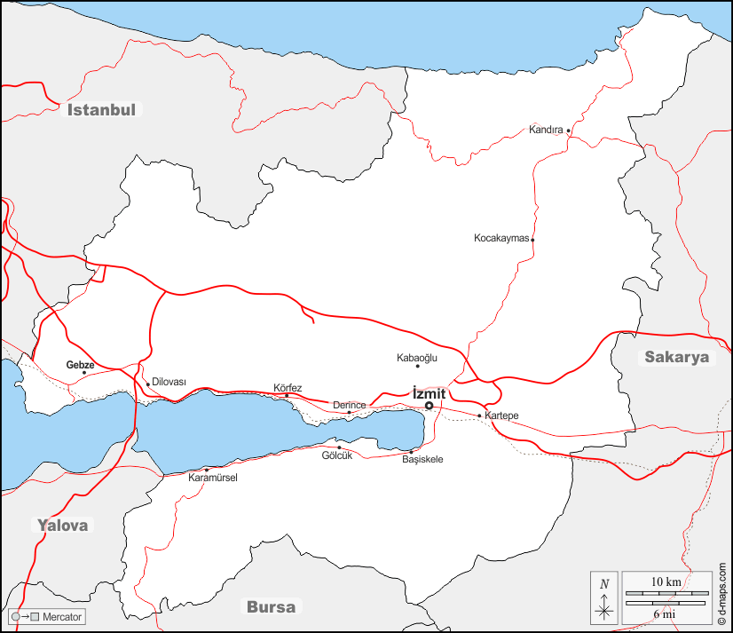 d-maps > एशिया > तुर्की > कोकाएली > सीमाओं, मुख्य शहरों, सड़कों, नाम
