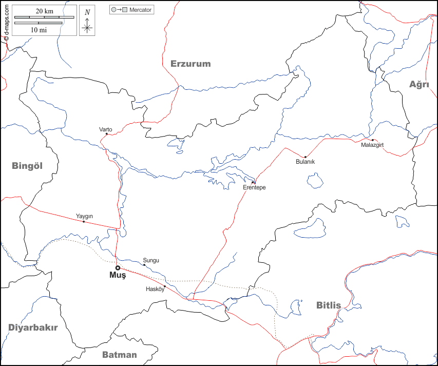 d-maps > एशिया > तुर्की > मुस > सीमाओं, जल-सर्वेक्षण, मुख्य शहरों, सड़कों, नाम, सफेद