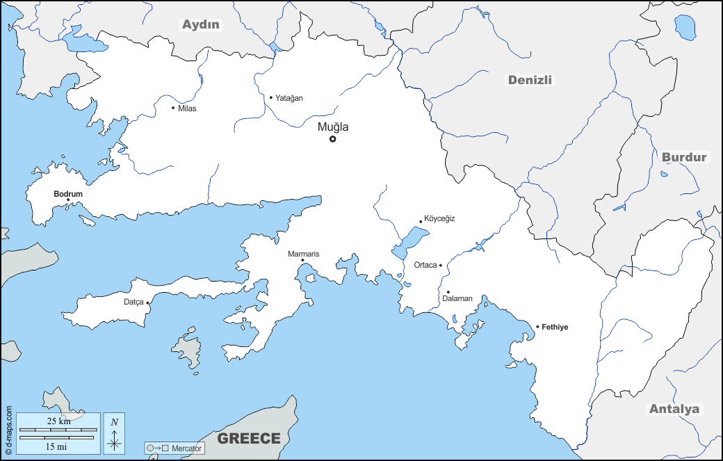 d-maps > एशिया > तुर्की > मुग्ला > सीमाओं, जल-सर्वेक्षण, मुख्य शहरों, नाम