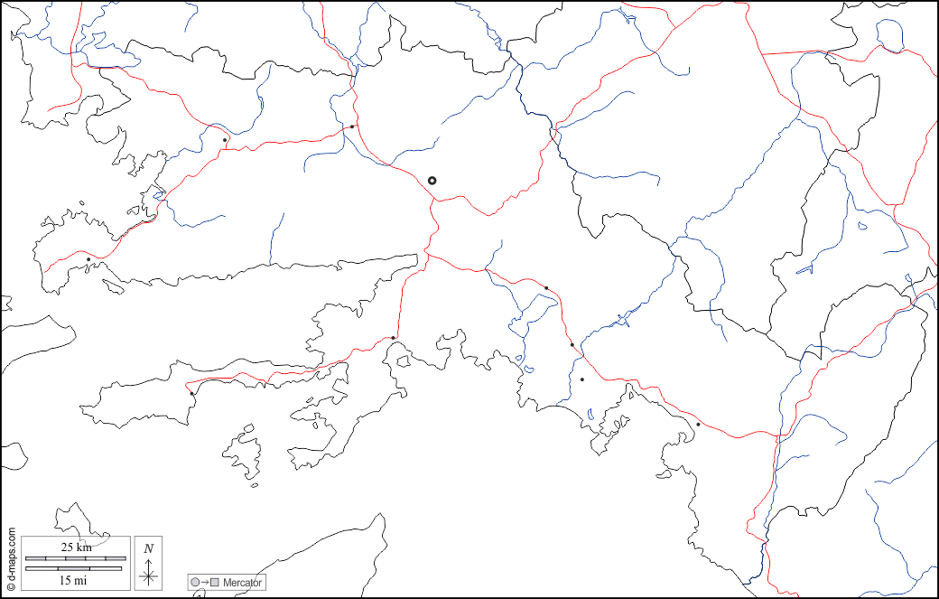 d-maps > एशिया > तुर्की > मुग्ला > सीमाओं, जल-सर्वेक्षण, मुख्य शहरों, सड़कों, सफेद