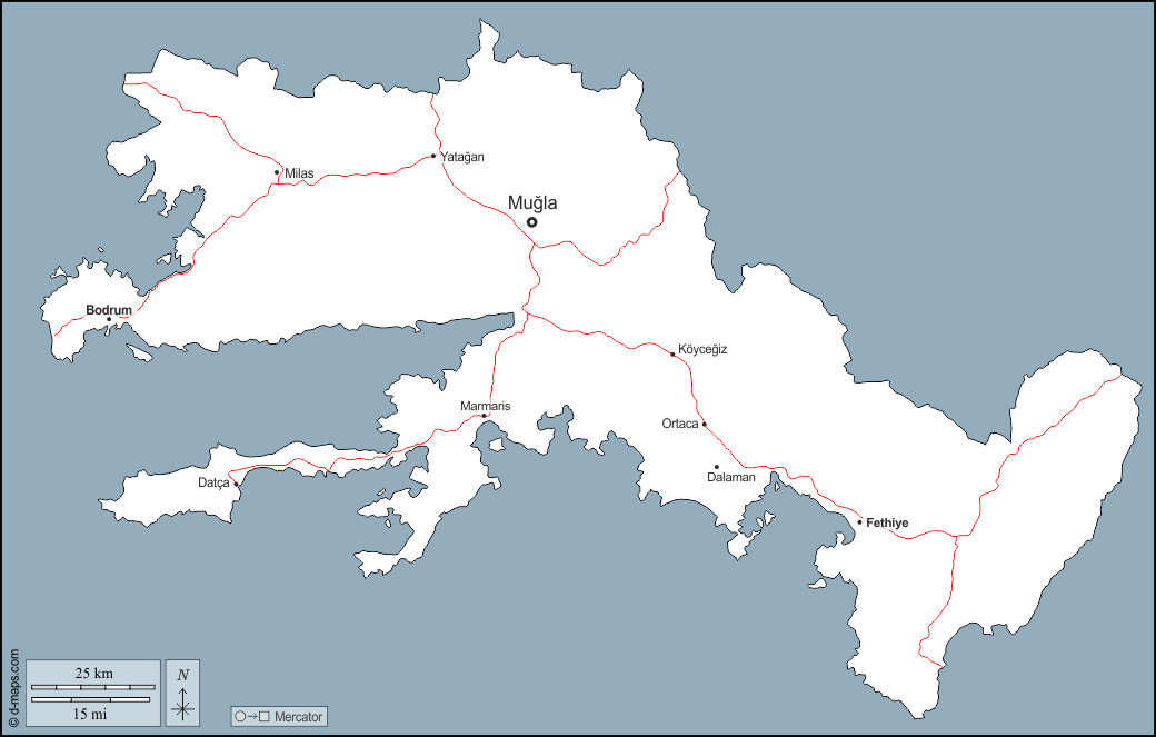 d-maps > एशिया > तुर्की > मुग्ला > बाह्यरेखा, मुख्य शहरों, सड़कों, नाम