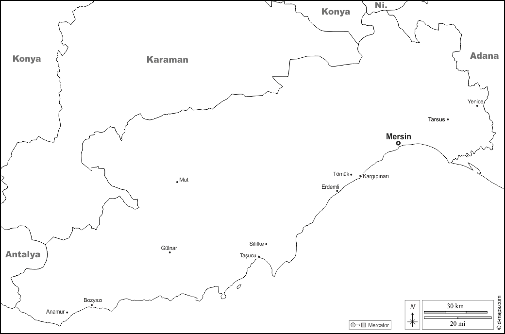 d-maps > एशिया > तुर्की > मर्सिन > सीमाओं, मुख्य शहरों, नाम, सफेद