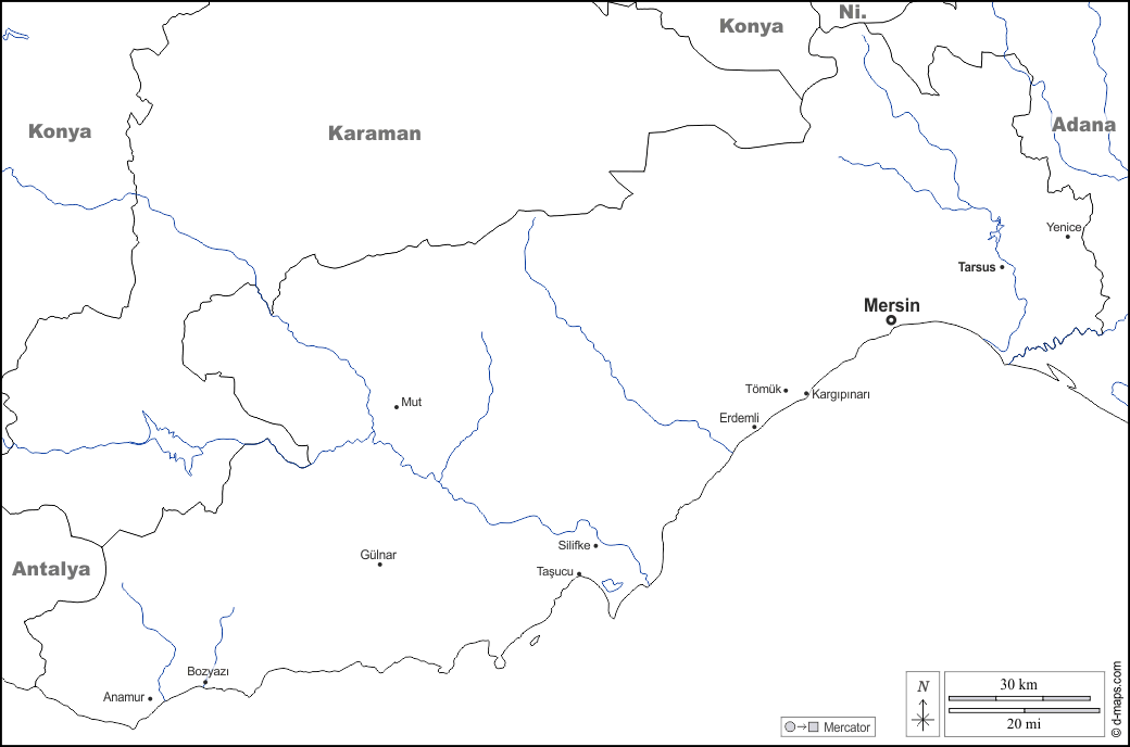 d-maps > एशिया > तुर्की > मर्सिन > सीमाओं, जल-सर्वेक्षण, मुख्य शहरों, नाम, सफेद
