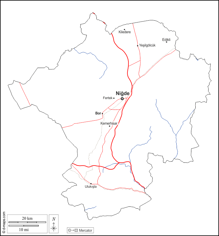 d-maps > एशिया > तुर्की > निगडे > बाह्यरेखा, जल-सर्वेक्षण, मुख्य शहरों, सड़कों, नाम, सफेद