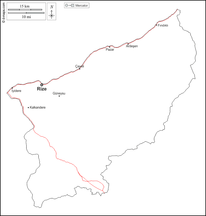 d-maps > एशिया > तुर्की > रिज़े > बाह्यरेखा, मुख्य शहरों, सड़कों, नाम, सफेद