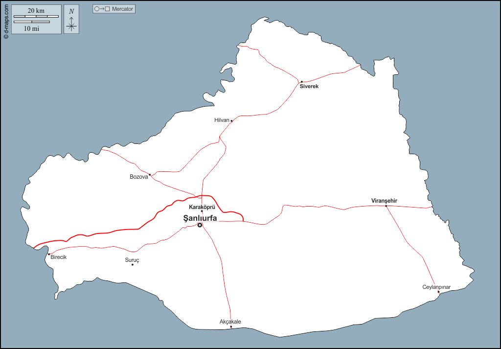 d-maps > एशिया > तुर्की > सनलिउर्फ़ > बाह्यरेखा, मुख्य शहरों, सड़कों, नाम