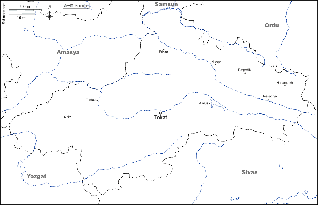d-maps > एशिया > तुर्की > तोकात > सीमाओं, जल-सर्वेक्षण, मुख्य शहरों, नाम, सफेद